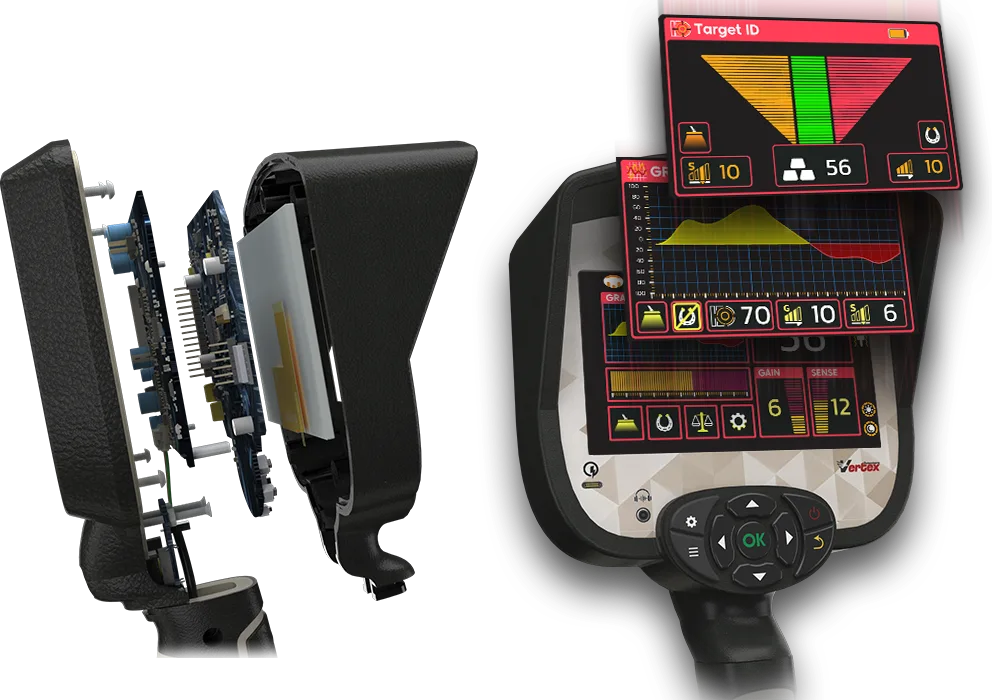 - رسم بياني توضيحي: يعرض الجهاز رسومات بيانية دقيقة توضح شكل الإشارة ونوع المعدن المكتشف (ثمين أو غير ثمين)، لتسهيل اتخاذ القرار الميداني.