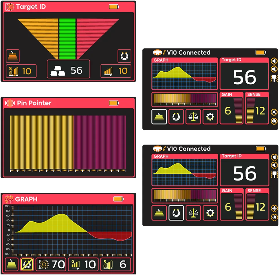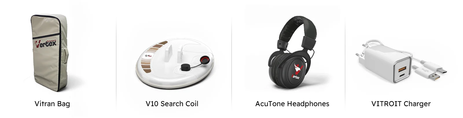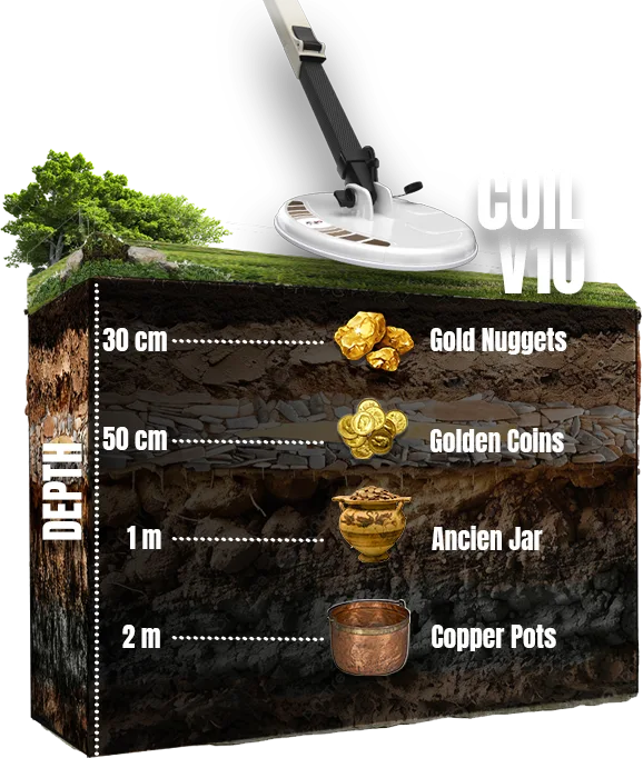 - العمق الأقصى للكشف: يصل إلى 2 متر باستخدام ملف V10، وقد يختلف العمق الفعلي حسب حجم الهدف، كثافة المعدن، نوع التربة، والظروف البيئية المحيطة.