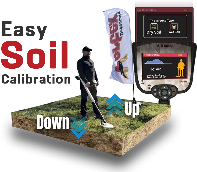 يتميّز الجهاز بنظام معايرة مزدوج (يدوي وتلقائي) يمكّن المستخدم من التكيّف بسرعة مع مختلف أنواع التربة، مثل التربة المعدنية، الرطبة أو الصخرية، مما يرفع من دقة الأداء ويضمن نتائج موثوقة في كل البيئات.